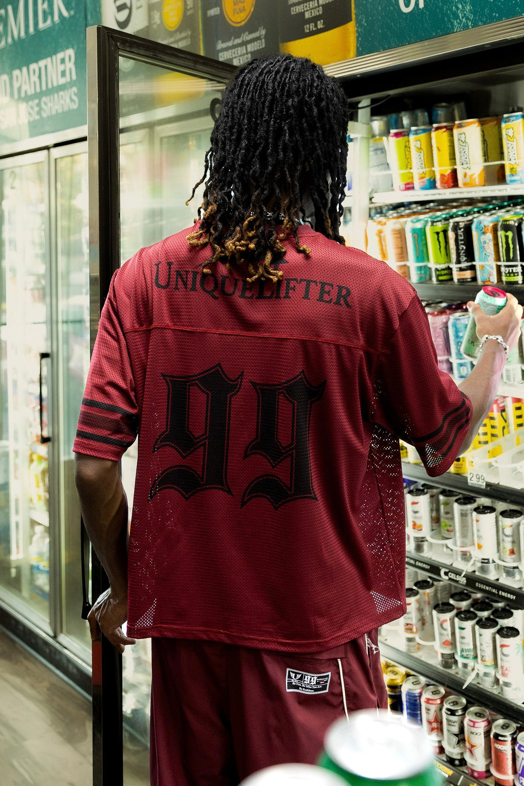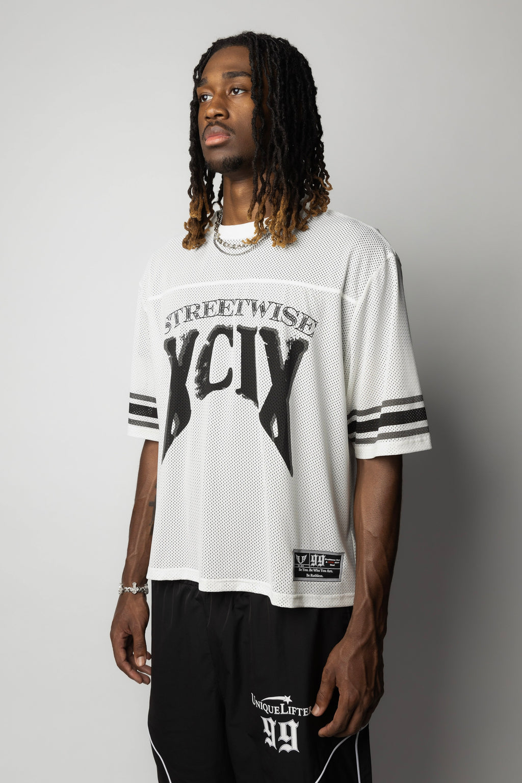 DESIGN: The Streetwise Football Jersey brings a bold edge to a classic athletic silhouette. Crafted from premium breathable mesh, it delivers both comfort and performance, perfect for everyday wear or making a statement on the streets. Featuring an boxy fit for a relaxed vibe, the design is finished with striking front graphics and sleeve stripe details, giving it that unmistakable streetwear energy. Built to stand out, this piece blends sport-inspired style with a fearless attitude.